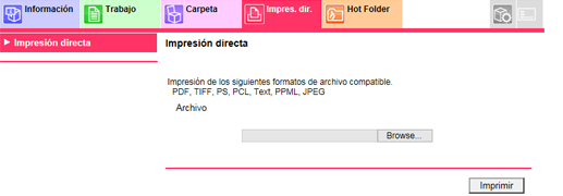 Impresión directa | Especifique un archivo guardado en el ordenador para imprimirlo utilizando la máquina sin usar el controlador de impresora. Los formatos de archivo compatibles son PDF, TIFF, PS, PCL, texto, PPML y JPEG. |