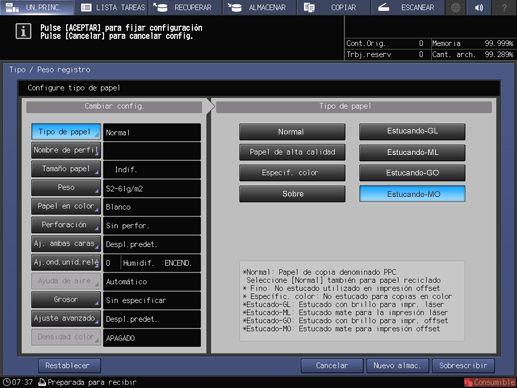 explicación adicionalPuede definir Tipo papel / Nombre de perfil / Tamaño de papel / Peso / Papel en color / Perforación / Aj. ambas caras / Aj.ond.unid.relé / Grosor / Densidad del color.