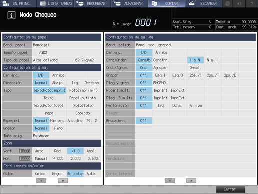 • requisito previoAjustes disponibles: Conf. papel, Configuración original, Zoom, Cara impresión/color, Ajuste de calidad, Configuración de salida, Aplicación