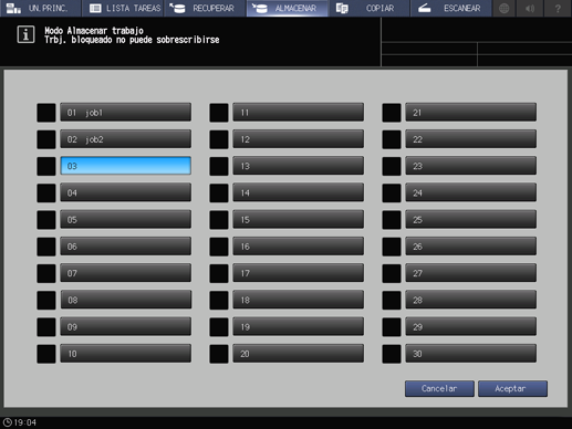 • explicación adicionalVerifique que el trabajo haya recibido un nombre. No es posible volver a la pantalla Modo Memoria aunque pulse Aceptar si antes no ha introducido el nombre del trabajo.