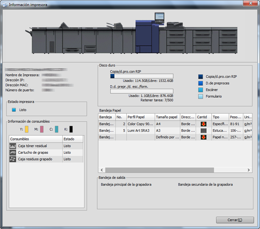 Puede mostrar la pantalla Información impresora haciendo clic en Información impresora en la pantalla Job Centro.