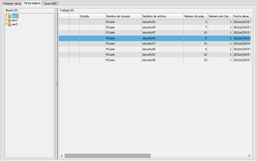 Fecha final de imprimir | Muestra la fecha de fin de impresión de la tarea segura. Las tareas que se duplican en la pantalla de Administración de tareas y las tareas que se guardan en la pantalla Editar de tarea, Editar página o Ajuste de curva de tono se muestran como "Sin imprimir." Las tareas que solo pueden editarse con el panel táctil del cuerpo principal se muestran en blanco. |