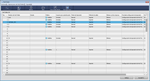 La lista de Hot Folder muestra las Hot Folder registradas en la máquina.