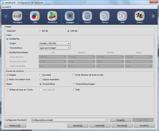Los elementos de configuración de esta pantalla son los mismos que los de la pantalla Imagen del controlador de plugin PS, excepto RIP de PDF. Para obtener más información sobre la descripción de los elementos de configuración común, consulte Pantalla [Imagen].