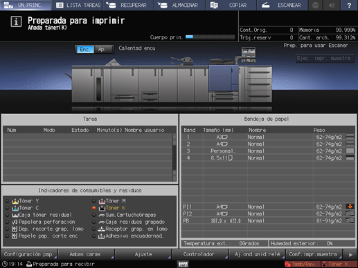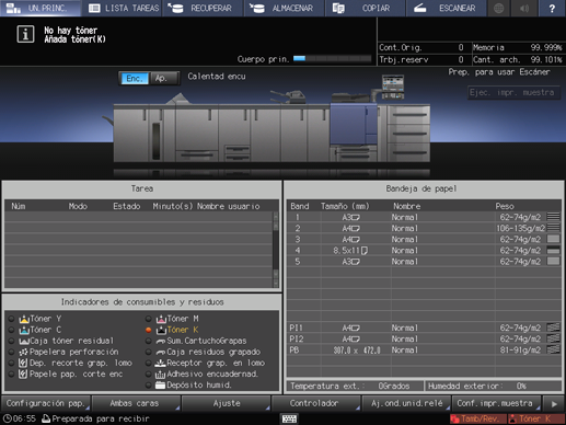 El indicador de color del tóner que va a reponerse se ilumina en rojo y el color de texto cambia a amarillo en la zona de Indicadores de consumibles y residuos de la pantalla UN.PRINC.