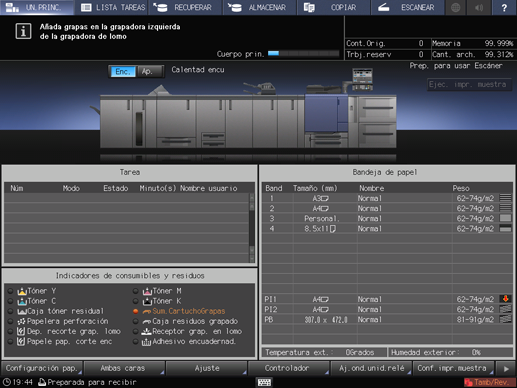 El indicador de Cartucho de grapas en el área de Indicadores de consumibles y residuos de la pantalla UN.PRINC. se ilumina en rojo, y el color de texto cambia a amarillo.
