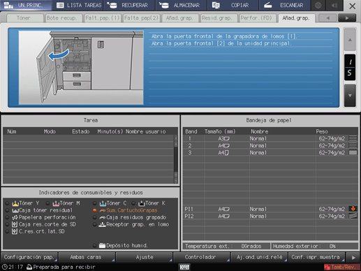 Si se acaban las grapas en la grapadora en el lomo SD-506 aparecerá el siguiente mensaje en la zona de mensajes de la pantalla.