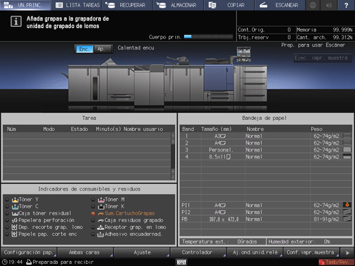 El indicador de Cartucho de grapas en el área de Indicadores de consumibles y residuos de la pantalla UN.PRINC. se ilumina en rojo, y el color de texto cambia a amarillo.