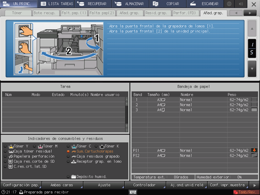 Si se acaban las grapas en la grapadora en el lomo SD-513 aparecerá el siguiente mensaje en la zona de mensajes de la pantalla.