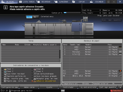 El indicador de Adhesivo encuadernad. en el área de Indicadores de consumibles y residuos de la pantalla UN.PRINC. se ilumina en rojo, y el color de texto cambia a amarillo.