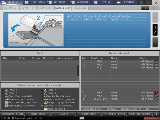 Si las cápsulas de cola se agotan durante la operación de la unidad de encuadernación PB-503, la máquina detiene el trabajo inmediatamente y la operación de encuadernado deja de estar disponible.