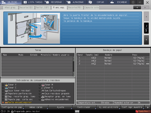 El indicador Parte encuad.espiral se ilumina en color rojo en la zona Indicadores de consumibles y residuos de la pantalla UN.PRINC.
