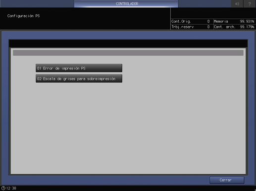 Esta pantalla se muestra si selecciona Configuración de impresión directa - Configuración PS en la pantalla Controlador menú de ajustes de máquina. Para obtener más información sobre cómo visualizar la pantalla Controlador menú de ajustes de máquina, consulte Descripción general del controlador.