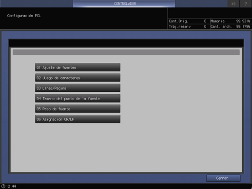 Esta pantalla se muestra si selecciona Configuración de impresión directa - Configuración PCL en la pantalla Controlador menú de ajustes de máquina. Para obtener más información sobre cómo visualizar la pantalla Controlador menú de ajustes de máquina, consulte Descripción general del controlador.
