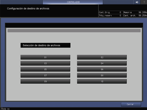 Esta pantalla se muestra si selecciona Configuración de transmisión de archivos en la pantalla Controlador menú de ajustes de máquina. Para obtener más información sobre cómo visualizar la pantalla Controlador menú de ajustes de máquina, consulte Descripción general del controlador.