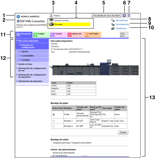 Después del inicio de sesión en PageScope Web Connection, se visualiza una pantalla como la que se muestra más abajo. A continuación, se muestra un ejemplo de la pantalla que se visualiza cuando se selecciona Info sobre dispositivo en la pestaña Información.