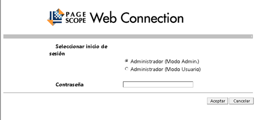 Al acceder con PageScope Web Connection se muestra la pantalla de inicio de sesión cuando la autenticación de usuario o el seguimiento de cuenta están activados en la máquina. Al iniciar de nuevo la sesión en la máquina como otro usuario o como administrador, cierre primero la sesión e iníciela nuevamente.