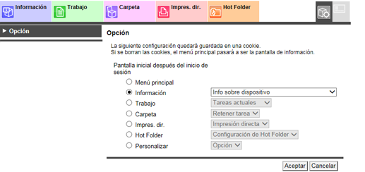 Información | Muestra la ficha [Información] después de iniciar sesión. Puede seleccionar qué pantalla de la ficha [Información] desea visualizar. |