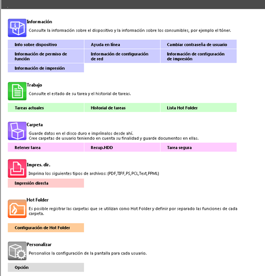 Cuando se muestra el menú principal, los elementos del menú que pueden utilizarse en el modo de usuario se visualizan en una única pantalla.