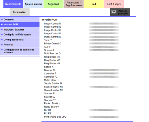Haga clic en Versión ROM en el menú de la ficha Mantenimiento para que aparezca esta pantalla.
