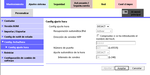 Haga clic en Config. fecha/hora - Config.ajuste hora en el menú de la ficha Mantenimiento para ver esta pantalla.