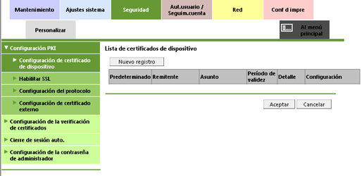 Uso del certificado emitido por una CA (entidad emisora de certificados) | Permite crear los datos de solicitud de emisión de certificados en la máquina y solicitar a una CA (entidad emisora de certificados) de confianza que emita el certificado para la máquina. Una vez finalizado el examen en la CA, registre los datos devueltos por la CA en la máquina. Para obtener más información, consulte Acerca de [Configuración de certificado de dispositivo] o Solicitar la emisión de un certificado. |