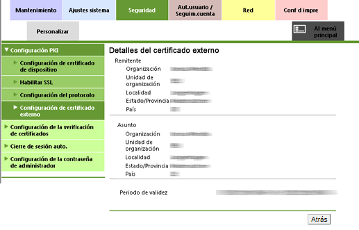 Se muestra una lista de los certificados externos instalados. Haga clic en Detalle en un certificado externo para ver sus detalles.