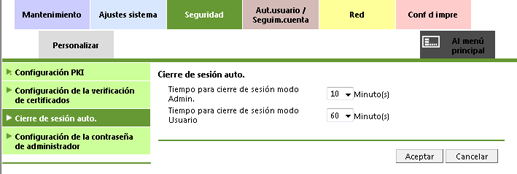 Permite especificar el tiempo de cierre de sesión del modo Administrador y del modo Usuario (público).