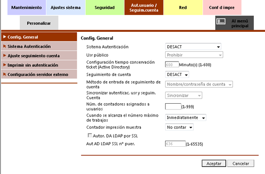 La pestaña Aut.usuario / Seguim.cuenta ofrece los ajustes relativos a las funciones de autenticación de la máquina.