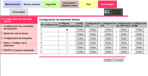 Los ajustes siguientes se supone que son una configuración y pueden especificarse hasta seis configuraciones. Seleccione una de estas seis configuraciones para cada puerto RAW en Selecc. Configur. de la impresora. Si utiliza un puerto diferente a dicha configuración en Selecc. Configur. de la impresora sin ninguna instrucción del controlador durante la impresión, la configuración especificada como predeterminada mediante un botón de radio en la Configura. predeterminada se refleja en la impresión.