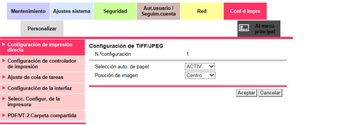 La configuración también se puede realizar desde Controlador en la pantalla UN.PRINC. Para obtener más información sobre la configuración, consulte Configuración TIFF/JPEG.