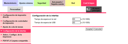 Haga clic en Configuración de la interfaz en el menú de la ficha Conf d impre para visualizar esta pantalla. La configuración también se puede realizar desde Controlador en la pantalla UN.PRINC. Para obtener más información sobre la configuración, consulte [Tiempo límite I/F].