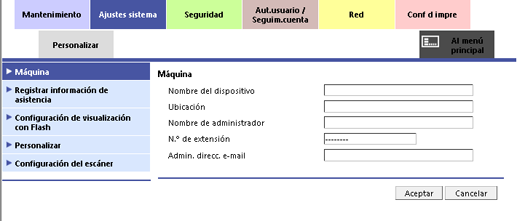 Configuración de la máquina | Esta pantalla le permite introducir el nombre del dispositivo, la ubicación y la información del administrador. Para obtener más información, consulte [Configuración de la máquina]. |