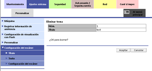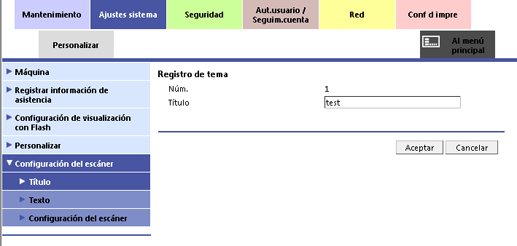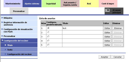 Haga clic en Configuración de escáner - Asunto en el menú de la pestaña Configuración sistema para visualizar esta pantalla.