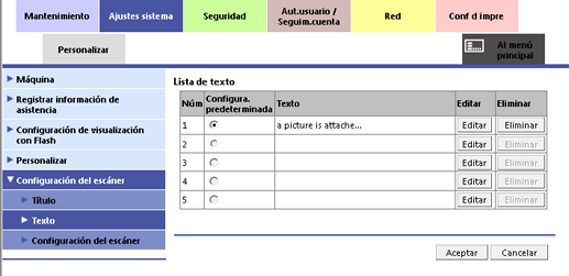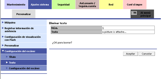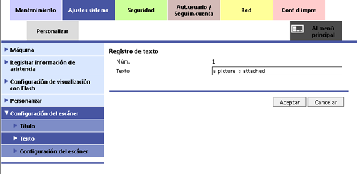 Haga clic en Configuración de escáner - Texto en el menú de la pestaña Configuración sistema para visualizar esta pantalla.