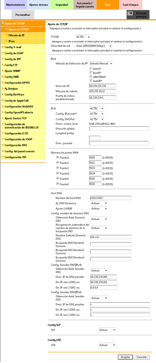 Configuración de JSP | Especifique los ajustes de JSP. Para obtener más información, consulte Pestaña [Red]: [Configuración JSP]. |