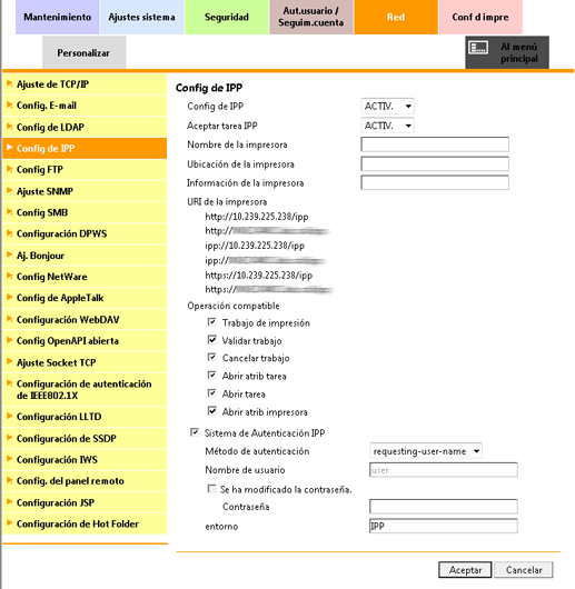 Haga clic en Config de IPP en el menú de la ficha Red para visualizar esta pantalla.