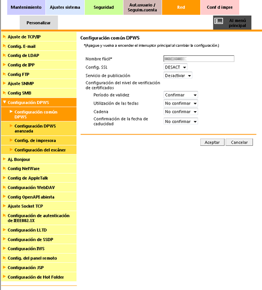 Haga clic en Configuración DPWS - Configuración común DPWS, en el menú de la ficha Red para ver esta pantalla. Esta pantalla permite configurar ajustes para detectar la máquina a través del servicio web.