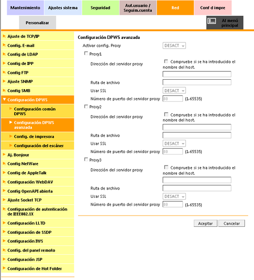 Esta pantalla permite configurar la impresión y el escaneado de datos a través del servicio web utilizando un servidor proxy.