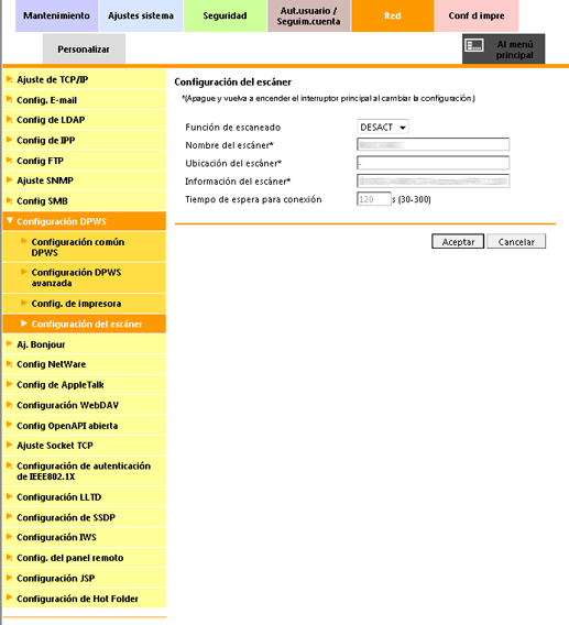 Haga clic en Configuración DPWS - Configuración del escáner en el menú de la ficha Red para ver esta pantalla.