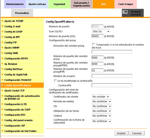 Haga clic en Configuración de OpenAPI en el menú de la ficha Red para visualizar esta pantalla.