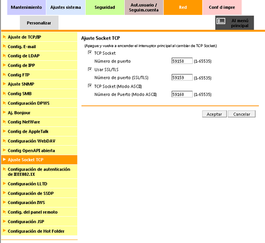 Haga clic en Configuración de socket TCP en el menú de la ficha Red para visualizar esta pantalla.