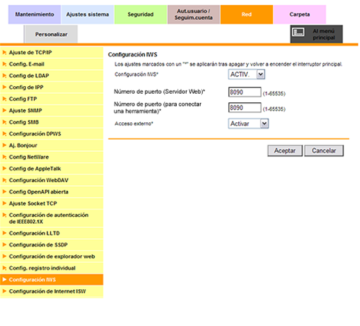 Esta pantalla permite seleccionar si utilizar el Internal Web Server (IWS). El uso de la función IWS permite transferir una aplicación de conversión de datos de impresión a la máquina y utilizar, entre otras funciones, la función de conversión de datos de impresión.