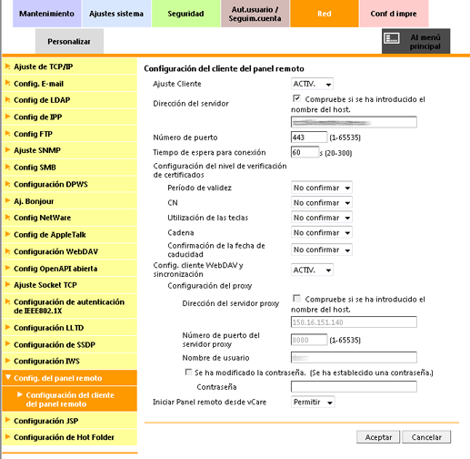Si desea utilizar un servidor proxy para acceder al servidor en el que se ha instalado el software dedicado, registre el servidor proxy. Para sincronizarlo con la configuración de cliente de WevDAV, seleccione ACTIV. en la lista desplegable Config. cliente WebDAV y sincronización. Si no desea sincronizarlo, configure los ajustes del servidor proxy, como la dirección de servidor.