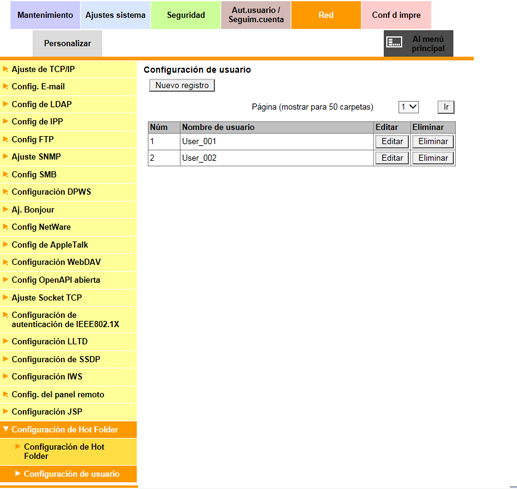 Haga clic en Configuración de Hot Folder - Config. usuario en el menú de la ficha Red para visualizar esta pantalla.