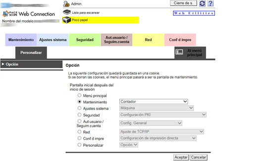 Esta pantalla permite especificar qué pantalla se va a visualizar al entrar en el modo de administrador de PageScope Web Connection.