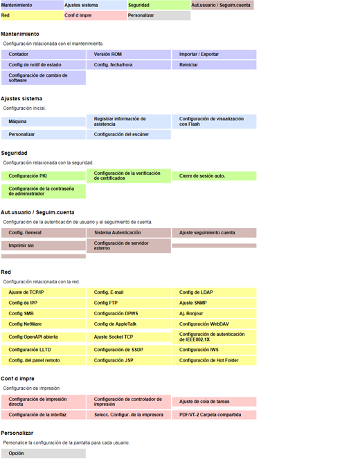 Cuando hace clic en la ficha Al menú principal, los elementos del menú que pueden utilizarse en modo usuario se muestran en una única pantalla.