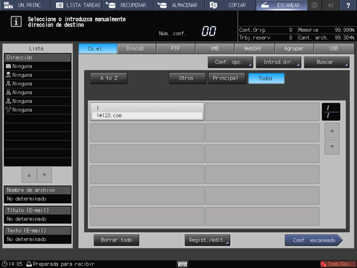 explicación adicionalDe manera predeterminada, se muestra la lista de direcciones de correo electrónico. Para obtener más información sobre la pestaña de destino predeterminada en la pantalla ESCANEAR, consulte [Configuración de usuario]: [Configuración escaneado].