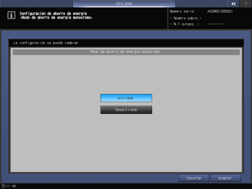 Pulse Configuración sistema en la pantalla Menú Configuración administrador máquina y, a continuación, pulse Config.ahorro de energía y Modo ahorro ener.monocr. de forma consecutiva.