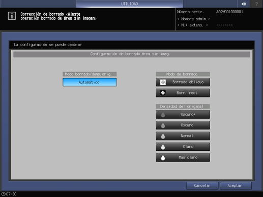 Defina el ajuste de borrado y la densidad de original que se debe utilizar cuando se seleccione la función de borrado de área sin imagen. El valor predeterminado es Automático.